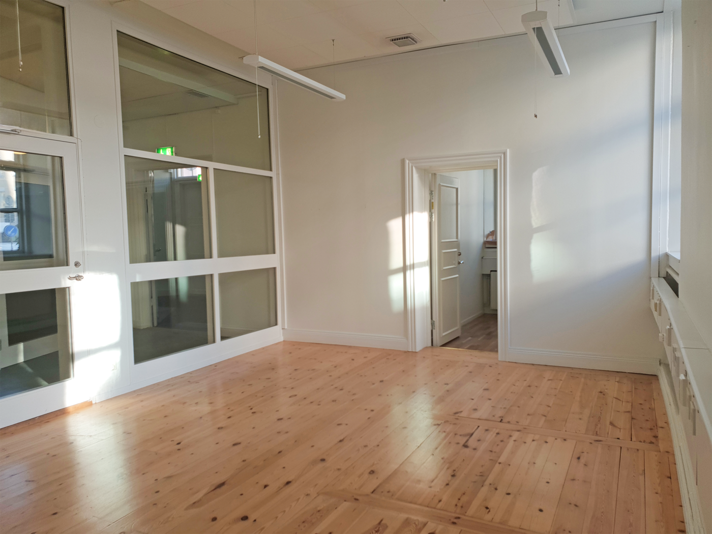 Ljus lokal på bottenvåningen med stora fönster mot Kungsgatan och Linnégatan. Lokalen består av två kontorsrum, som båda har ljusa väggar och trägolv. Det större rummet har glaspartier mot den häftiga kyrksalen och de gemensamma ytorna. Tillgång till kök, matsal, loungemöblemang, toaletter och ett konferensrum som bokas kostnadsfritt vid behov.