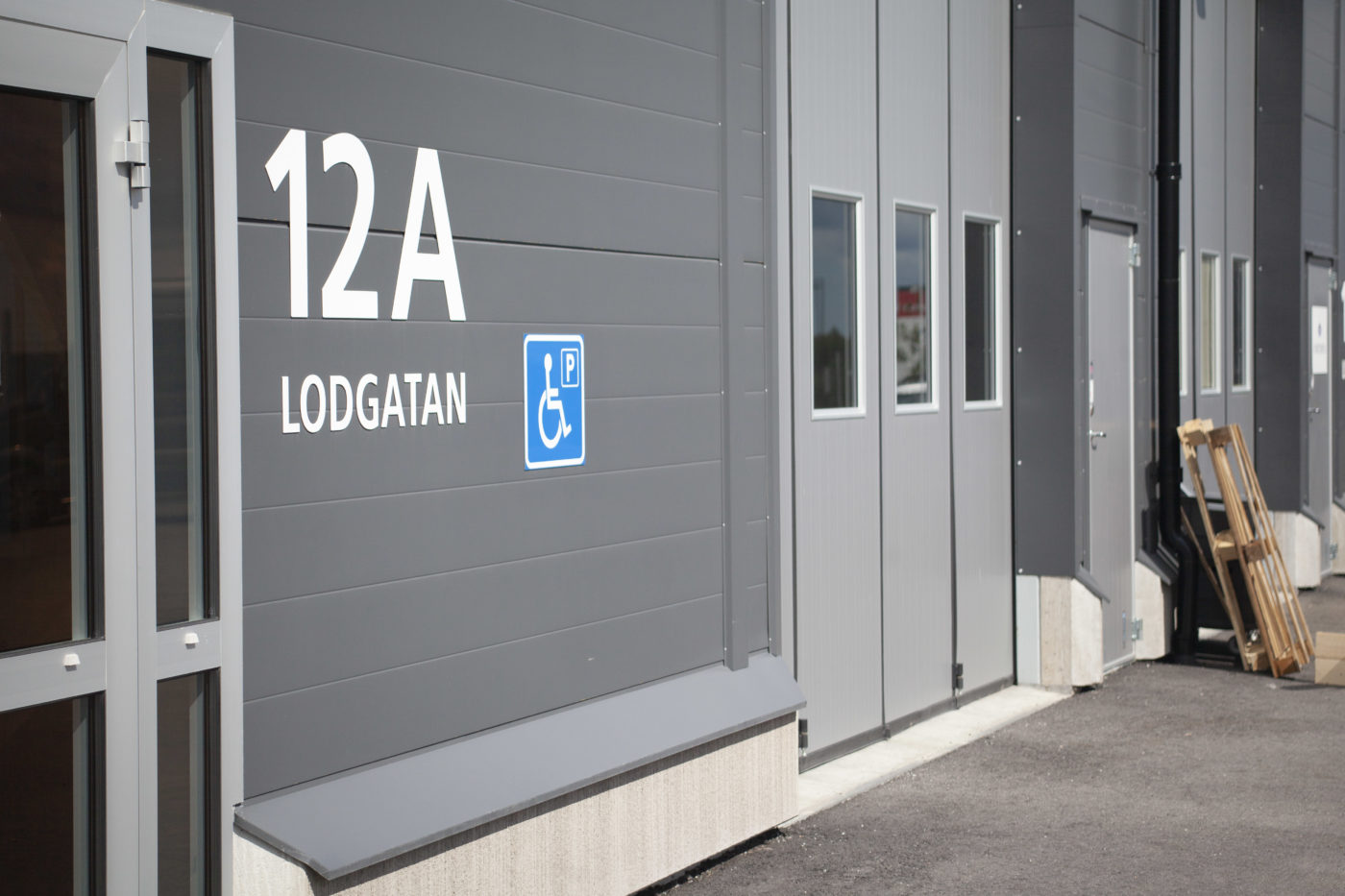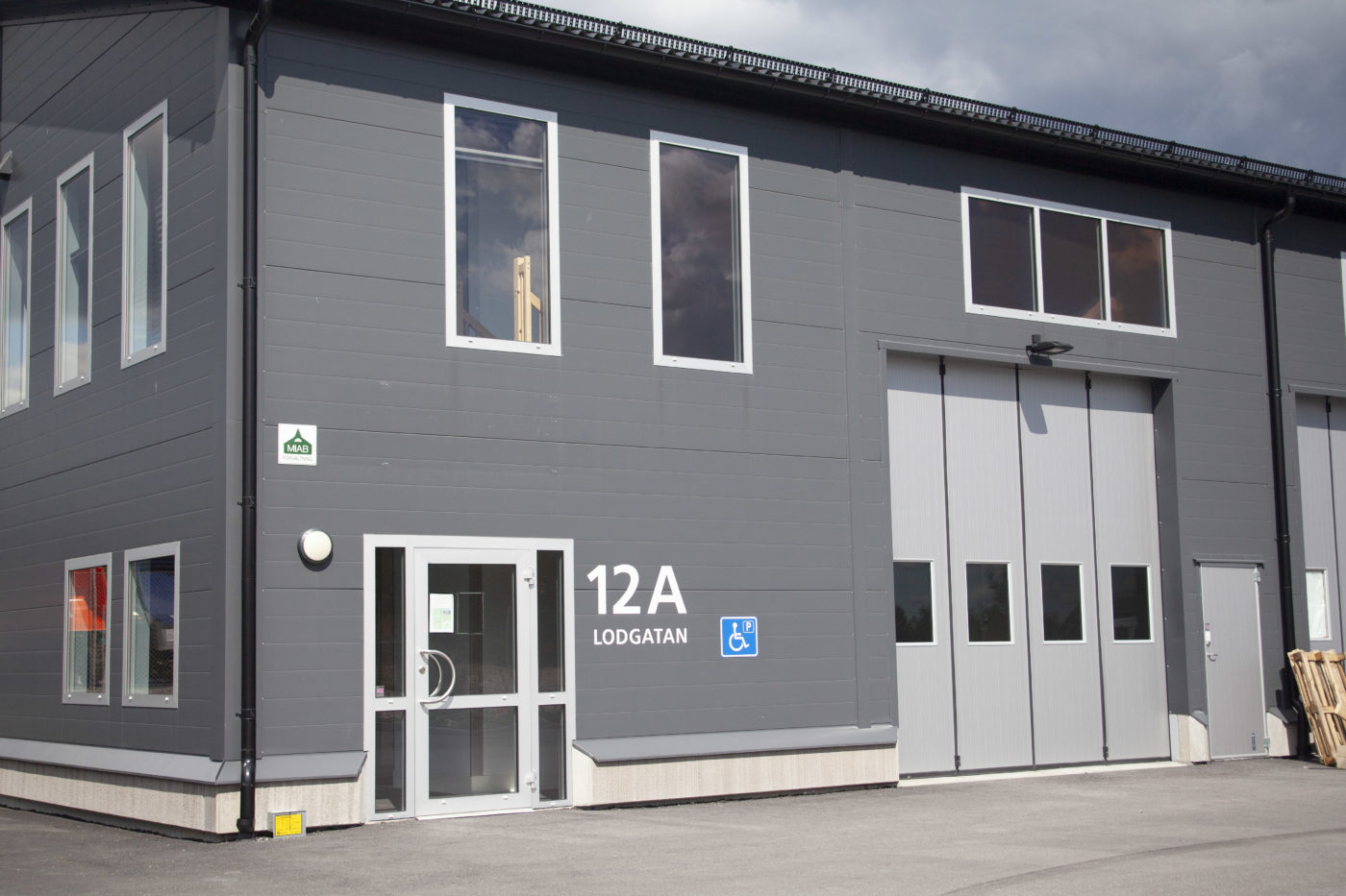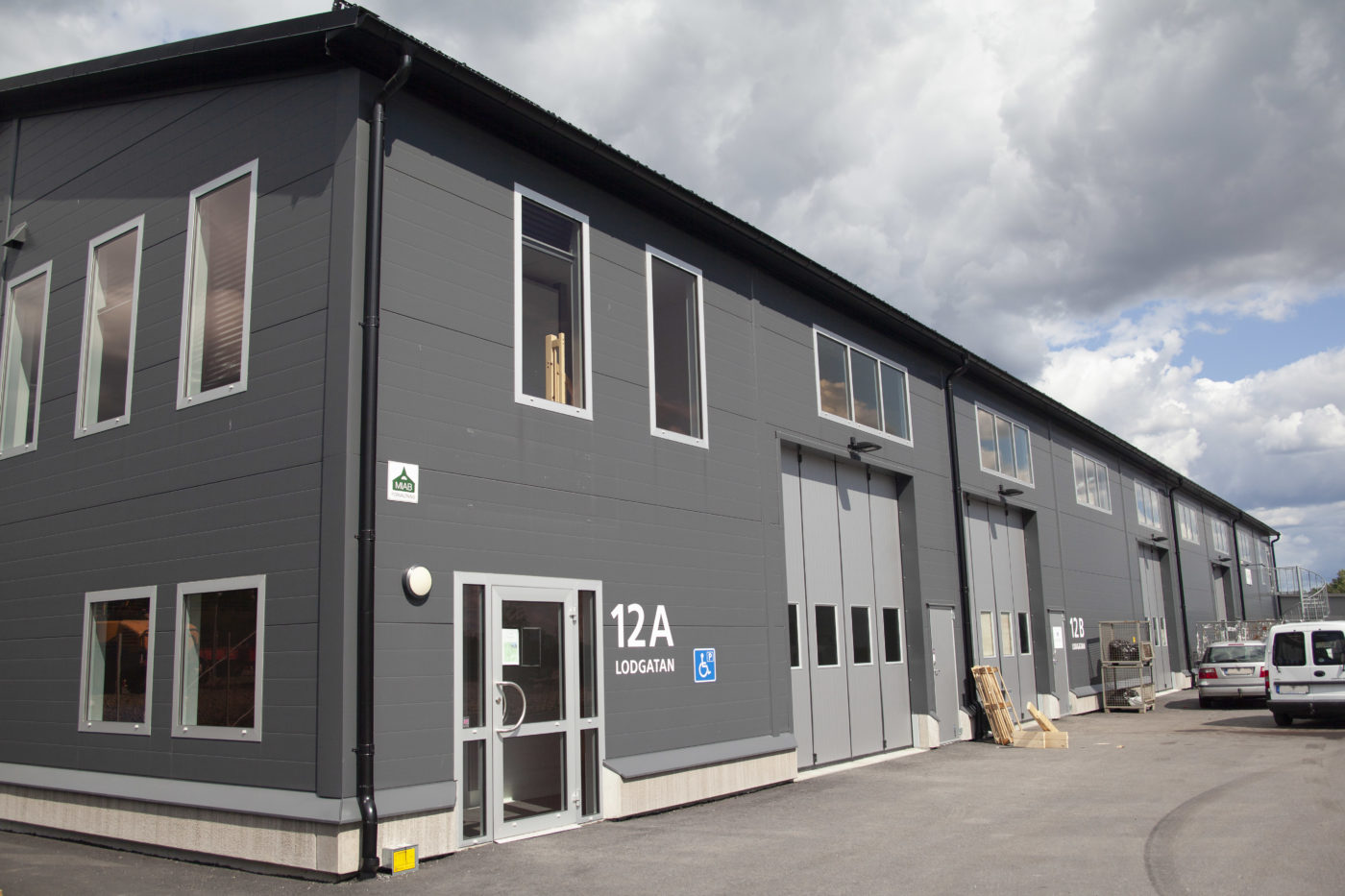 Denna industrifastighet på Lodgatan byggdes av oss och stod klar hösten 2018. Huset består av tre lokaler i olika storlekar med både lager- och kontorsytor. Samtliga lokaler har hall/lager med oljat betonggolv, högt i tak och portar för lastning. Runt fastigheten finns svängrum för större fordon samt parkeringsytor. Huset är försett med bergvärme- och kyla samt solceller på taket. Egenproducerad el levereras till hälften av husets beräknade årsförbrukning.